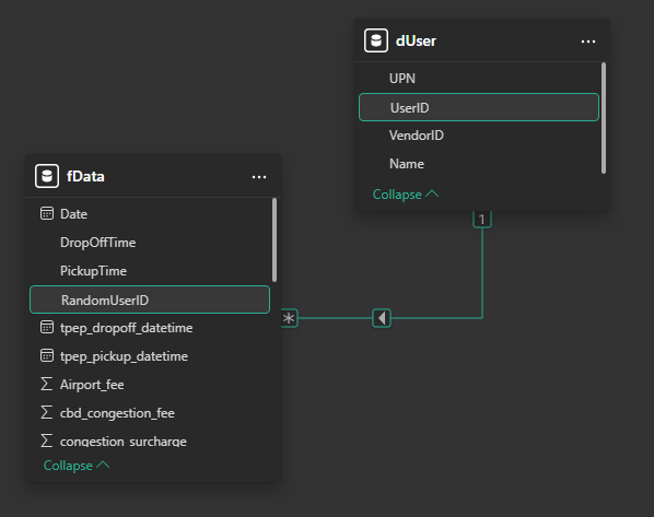 In my model, I’ve related UserID to my totally not made up column “RandomUserID” in the facts table with data.
