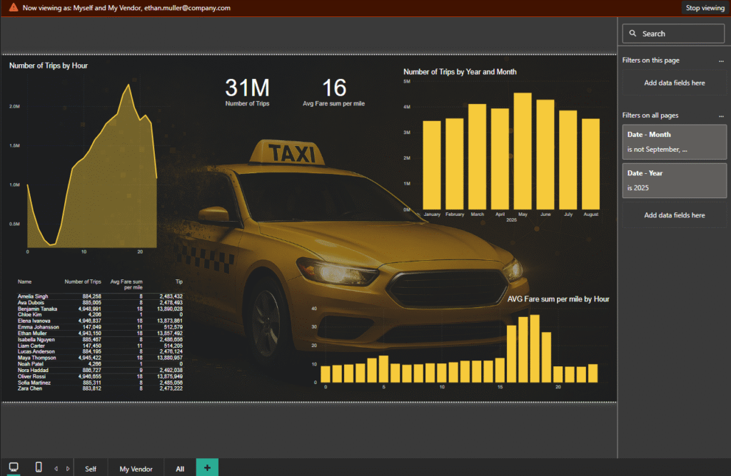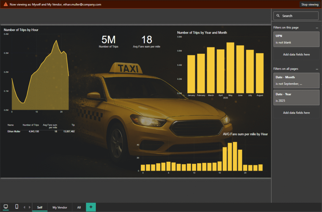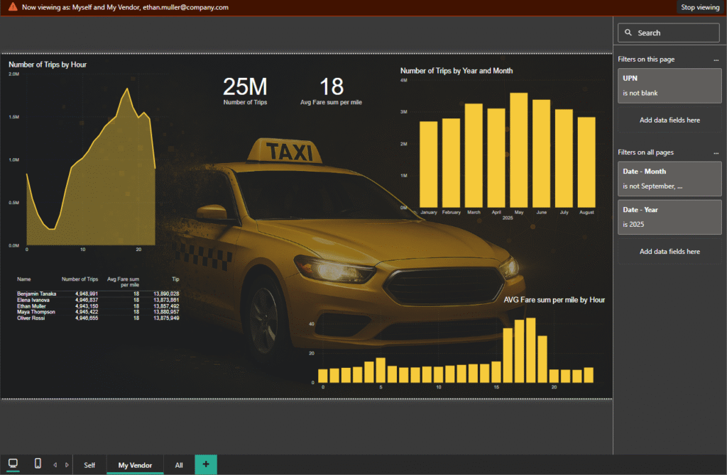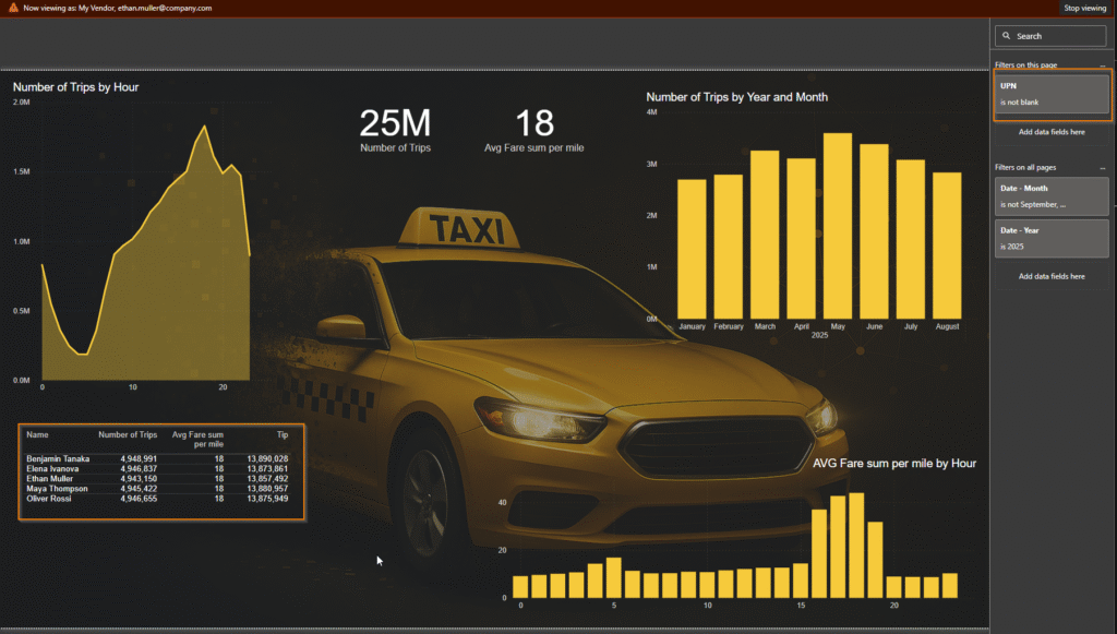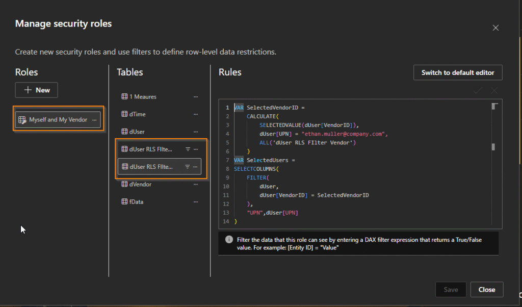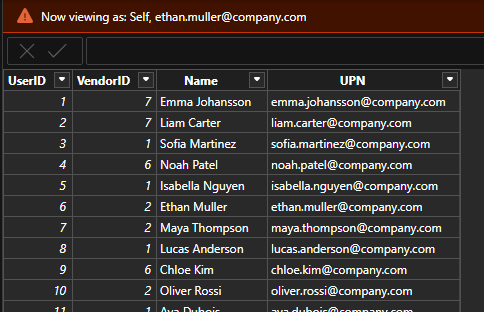 This measure will pick up the “Vendor ID” value of the current user and then collect the UPN from all other users with the same Vendor ID, finally it filters the RLS table based on these users, meaning you automatically see your peers on the page and not just yourself.
