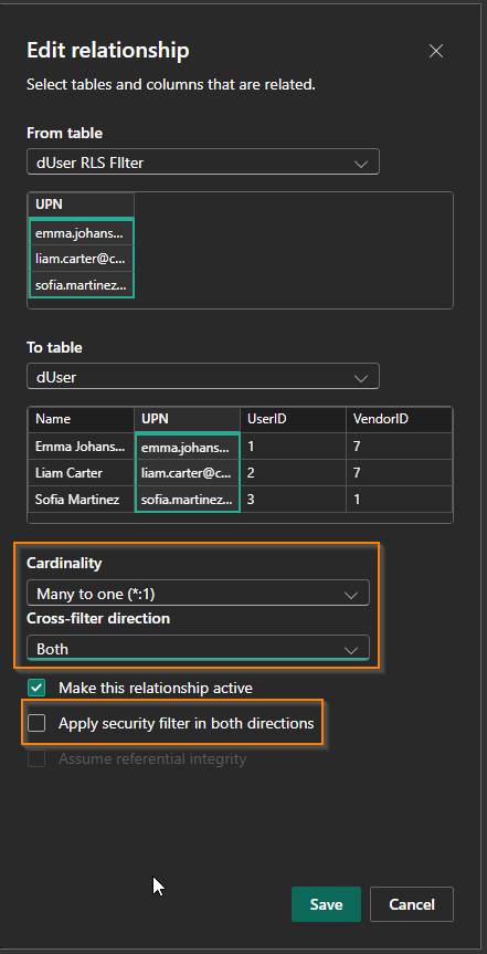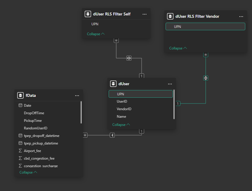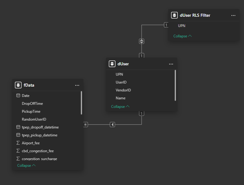 The issue with this is that 1-1 will always go both ways and this includes security filtering, so if I set RLS filtering on this table now, it’s the same as if I just did it on the dUser table to begin with.