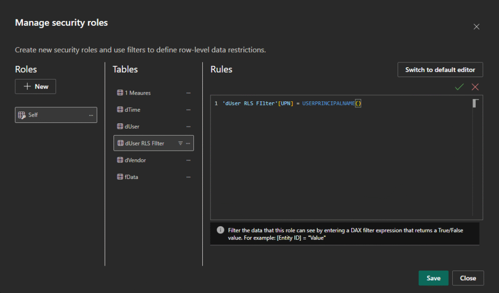 OK so let’s make an alternative. Instead of simply saying your USERPRINCIPALNAME() is UPN, we can make a bit more advanced DAX filter for the RLS Query.