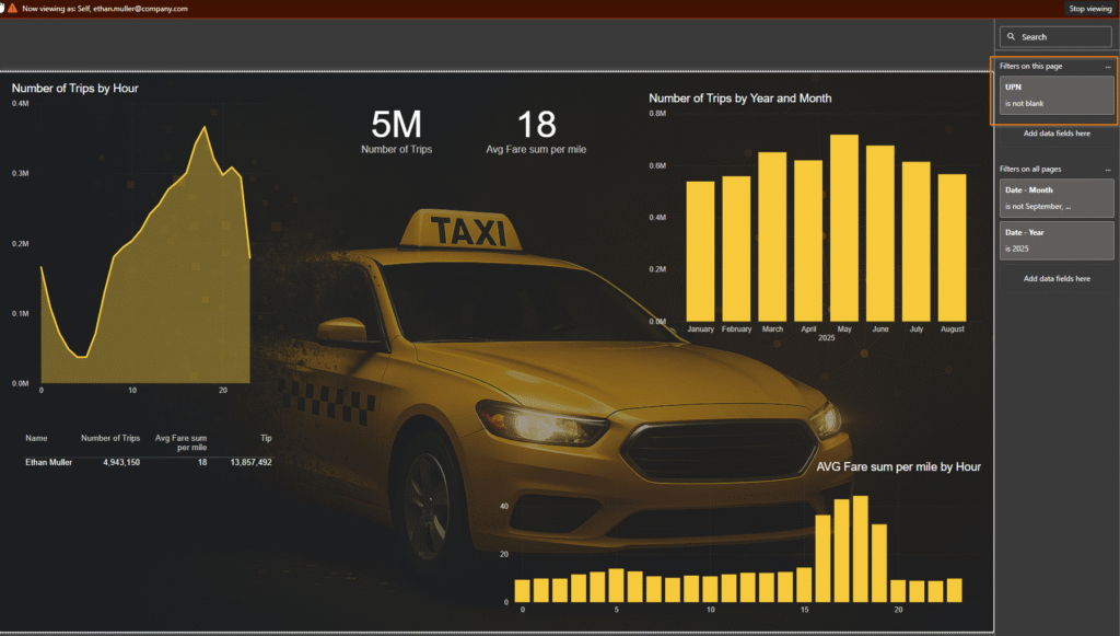 Why does this work? Well because Ethan is only allowed to see 1 row in the RLS table, and that’s the row corresponding to his UPN. Only one user in the dUser will have a value in the RLS table related to it, all the others will be blank and due to our Page filter, these users now disappear.
